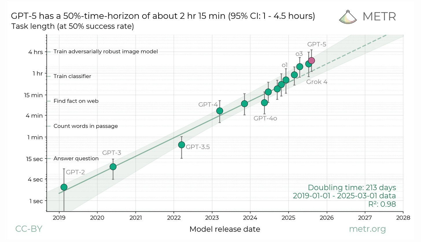 METR has found a surprisingly consistent relationship in frontier models over time, in terms of the length of tasks they can accomplish: that every 200 or so days, the new frontier models have become capable of accomplishing tasks that take twice as long. Note that this estimate only applies to certain types of tasks (particularly software engineering). For a more-detailed explanation of this work, see “Measuring AI Ability to Complete Long Tasks”, “Details about METR’s evaluation of OpenAI GPT-5,” and “The most important graph in AI right now: time horizon.”